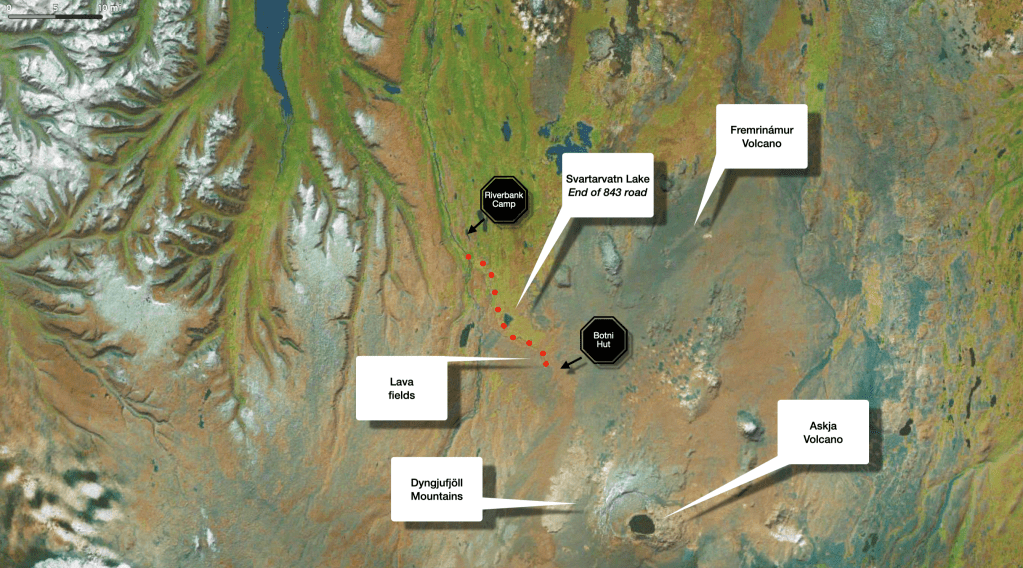 Anyway, I wrote around 2/3s of this blog before I discovered this gem of a website: Catalogue of Icelandic Volcanoes. Not only it gives you the location of the volcanoes (Ok, I can get this from 100 other websites), but the precise information about everything it is known about them, researched and scientifically published, and more poignantly, it includes map layers of the lava flow post-eruption. So according to that, when I was swearing at those volcanic rocks around Botni, unbeknownst to me, I was directing them towards Fremrinámur and Bárðarbunga (Bardarbunga) volcanic eruptions. Fremrinámur is dormant and lies around 50km to the east as the crow flies from where we were. Its last eruption was more than 2,500 years ago, and its lava must have reached the edges of our path. From the west was the even larger Bárðarbunga, under Vatnajökull (Vatnajokull) glacier – one of seven volcanoes covered by it – whose most recent eruption was in 2014.