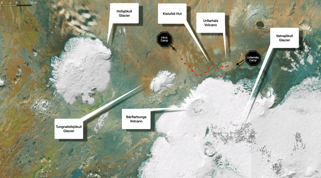 At 800m elevation, Nýidalur valley sits at the official borders between the Northeastern and Southern areas of Iceland and surrounded by glaciers: Hofsjokull to the West, Tungnafellsjökull immediately to the east, and further out, Vatnajökull. Come on, keep up.