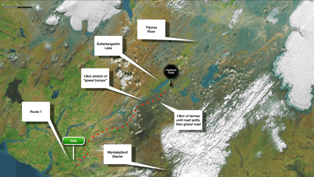 For months during the planning process, we were in contact withone incredible GuðrúnMaría, the hotel’s employee, arranging for a parcel with supplies to be sent to us there in advance. What a saint! But what a palaver also! The confusion was that Icelandic postal services, having initially assured us they can deliver to the highlands, we belatedly discovered they could not. They never had. But the formidable Guðrún had arranged for someone from the hotel (her boss!) to pick the parcel from Hella on our behalf. And so the parcel was waiting for us there, upon arrival. Unbelievable. Incredible people at that hotel, throughout, as in most places in Iceland.