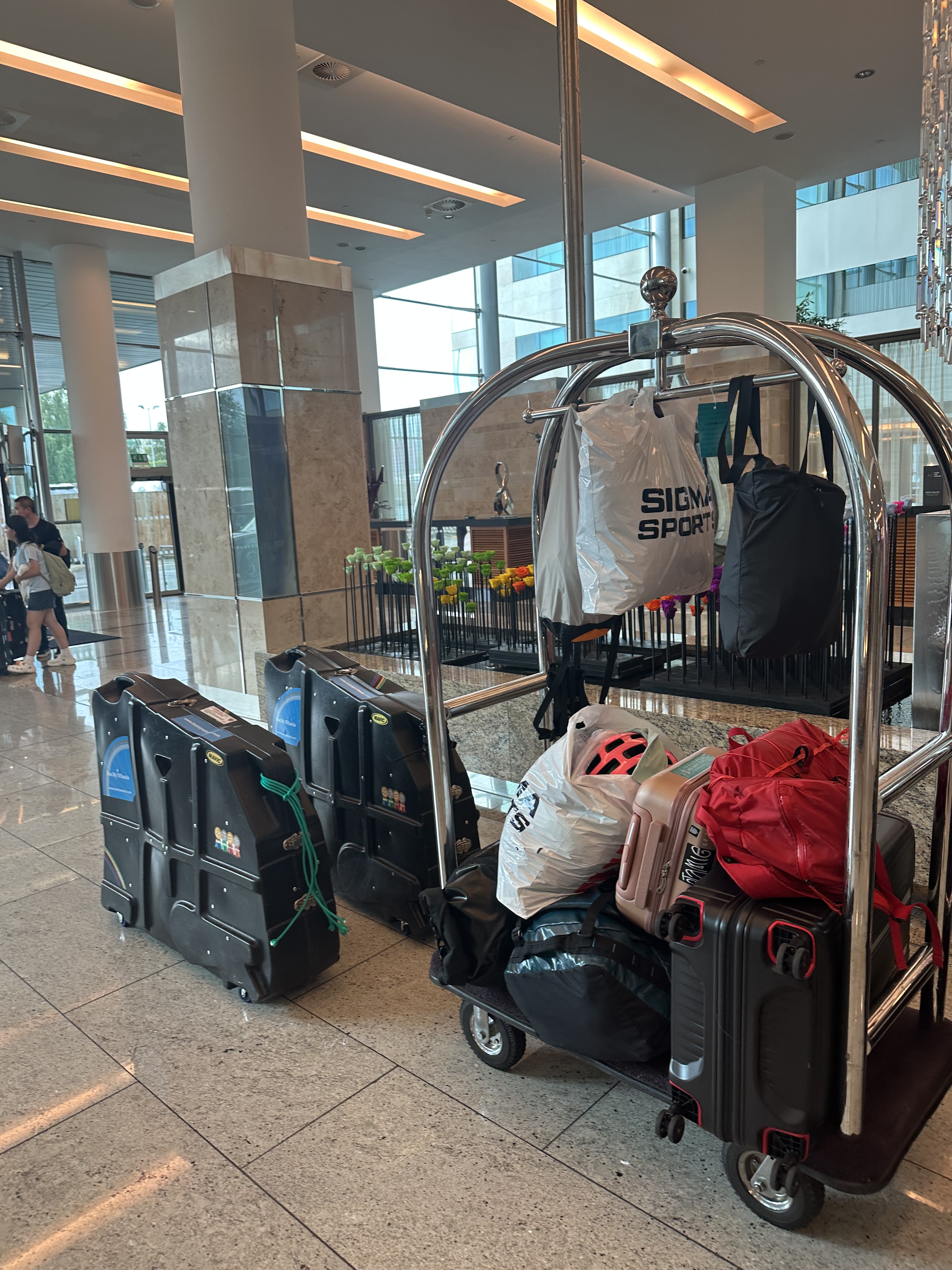 Suitcase, checked-in (23kg): casual clothes and bike bags, prepared as we would carry them on the bike.