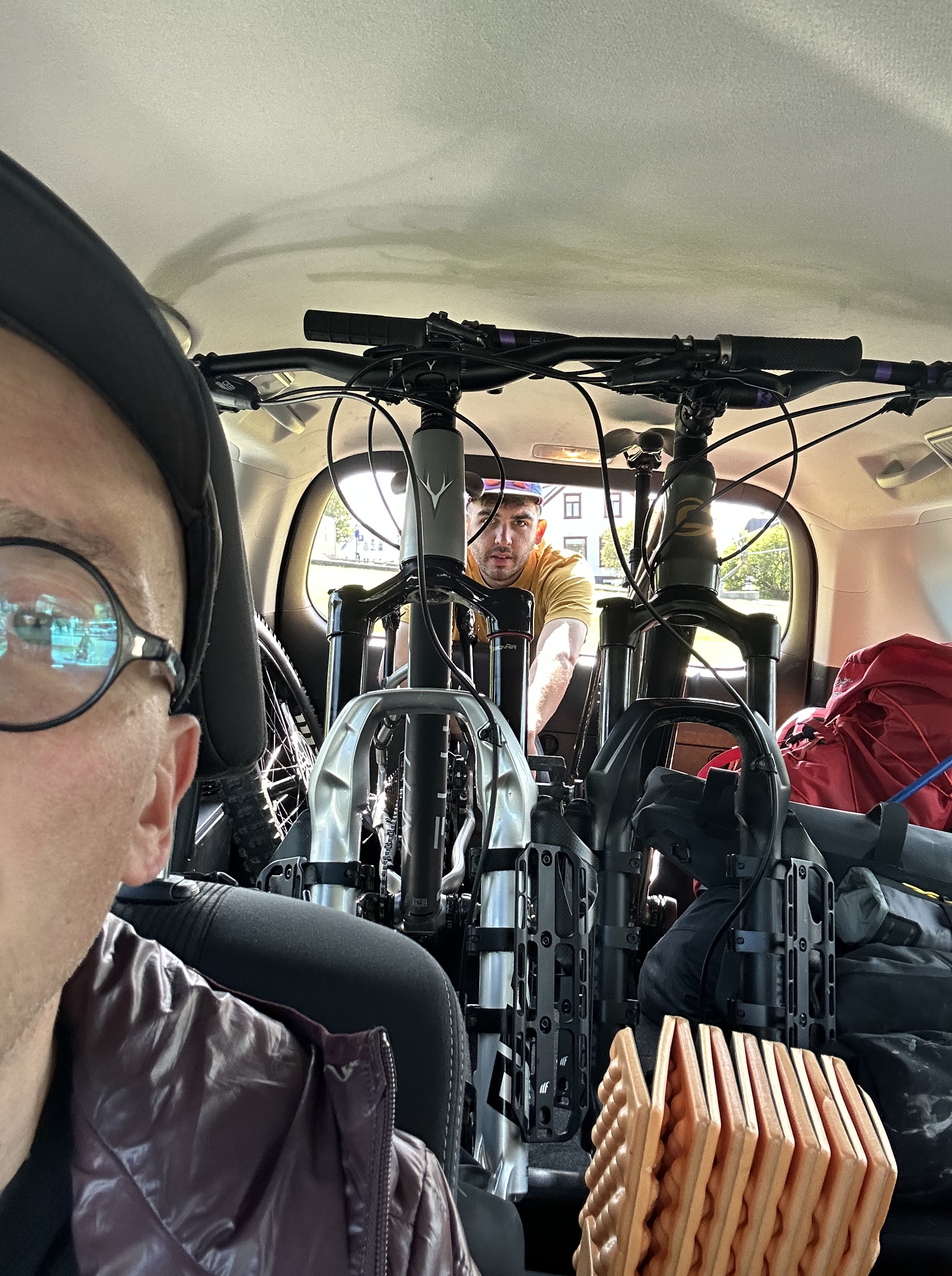 Oh, but wait, no journey could start without sorting out Josh’s dropper seat, which would activate all by itself. Off we went, back and forth around town to find an open bike-shop, and then, et voila, the seat shorted itself out, somehow, and behaved admirably ever since. And now we thought, we can set off!