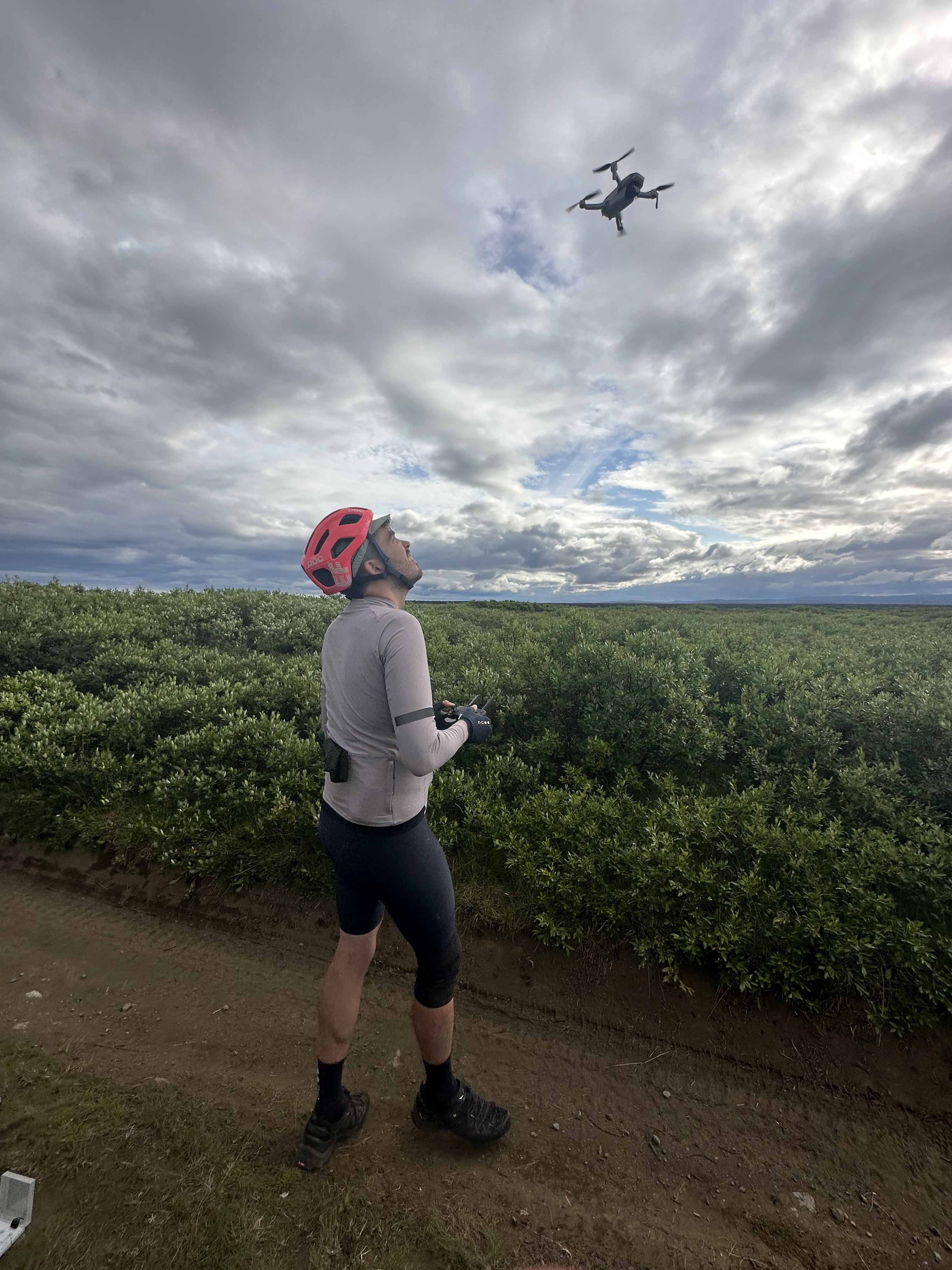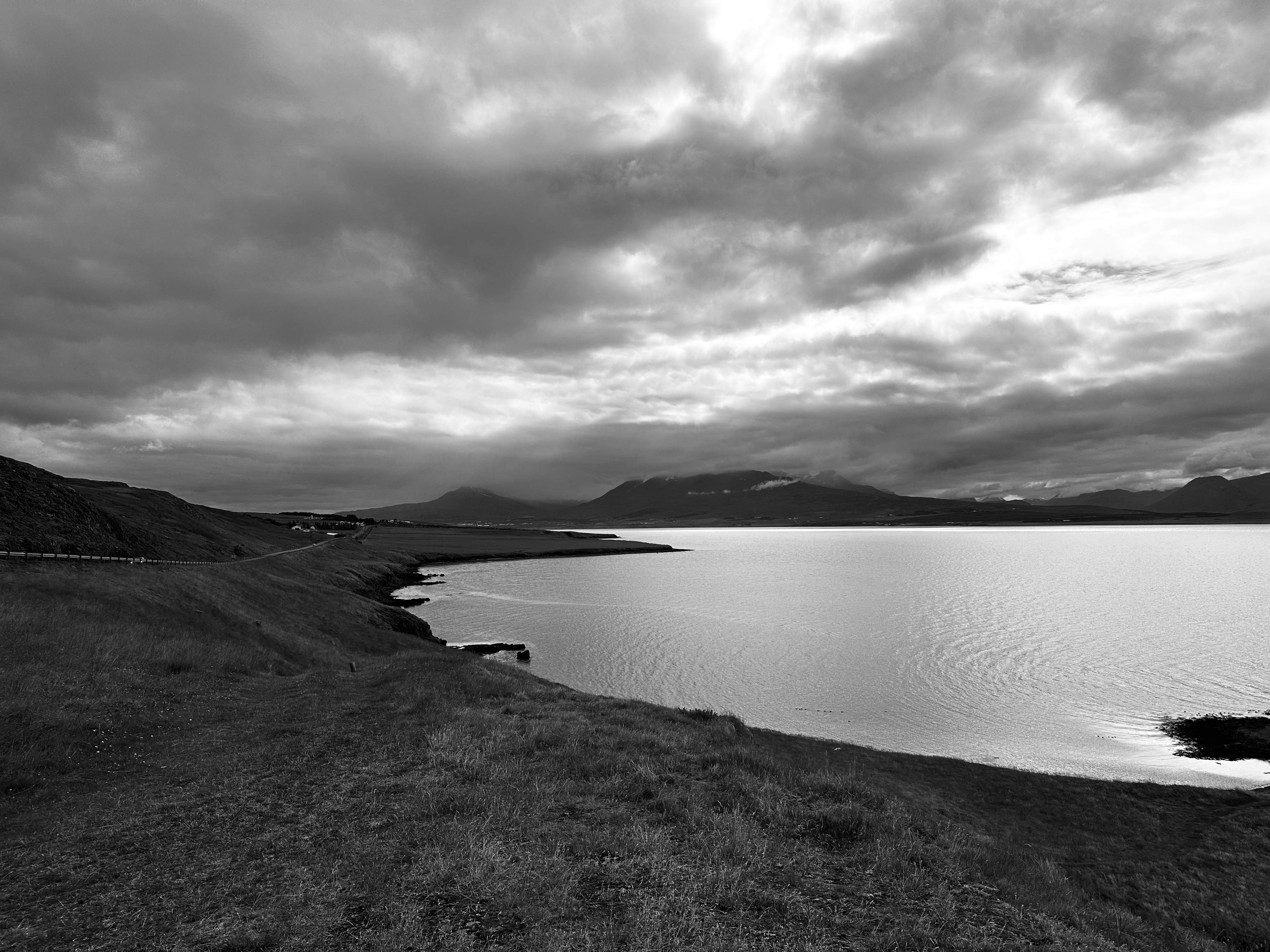 There are couple of roads (821, 829) leading out of Akureyri directly to the south towards one of the largest valleys and agricultural regions in Iceland, Eyjafjarðardalur. Instead, we crossed the bridge to the east side of Eyjafjörður, then ventured north for 16km, before climbing a 5.5km hill as we turned to South-East towards Fosshol. When we reached the top, Josh took advantage of the views over the fjord and used his drone.