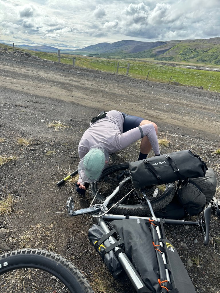 Anyhow, back to the first tubeless flat. Every time we were attempting to fix it (duck tape around the spoke, then with superglue, etc), it meant we needed to pump it every time, check the result, before we had to start again, and then eventually put in one of the emergency tubes we brought with us. After a couple of hours, we set off stressing out how on earth we would get to Botni to essentially finish what was yesterday’s ride (34km) and then move on straight for another 70km odd. Of course, we accepted reality soon after. We lost a day but had planned for it anyway, so we’d trim a day from the end of our trip which we had saved for our Reykjavik stay.