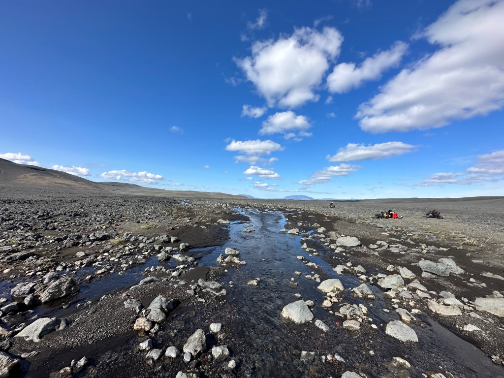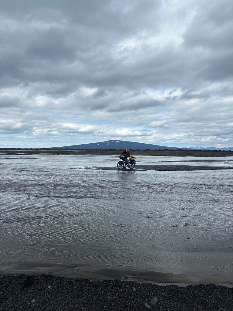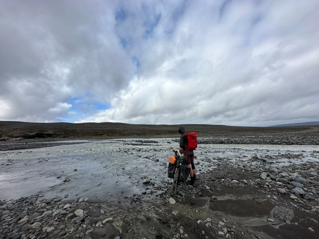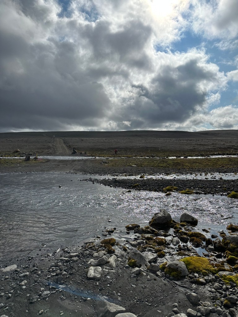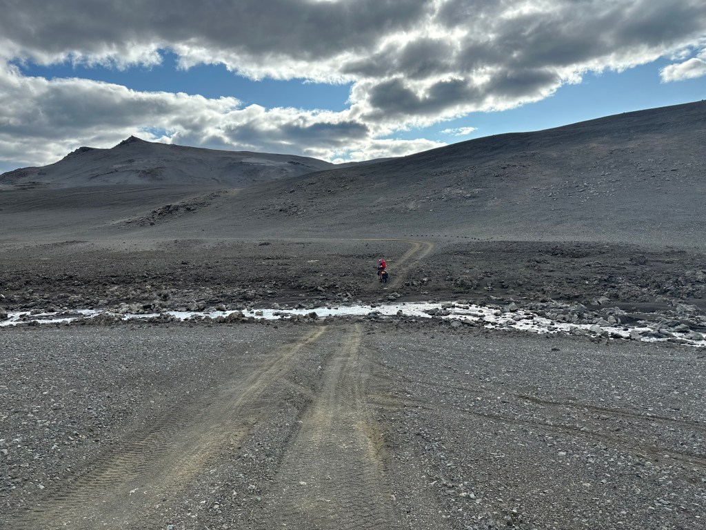 We carried on through some seriously open spaces and varied terrain, including lava fields from Iceland’s biggest shield volcano Trölladyngja, imposing in the north to our right. We did have to push the bike a couple of times, and crossed our first river of the day.
