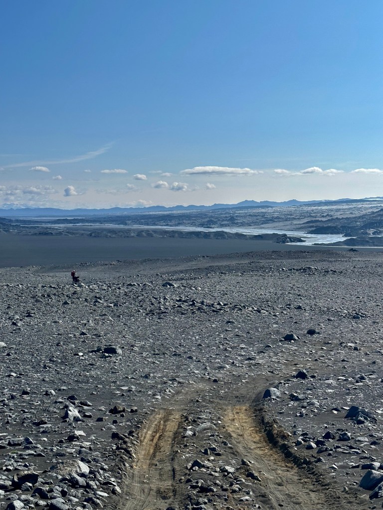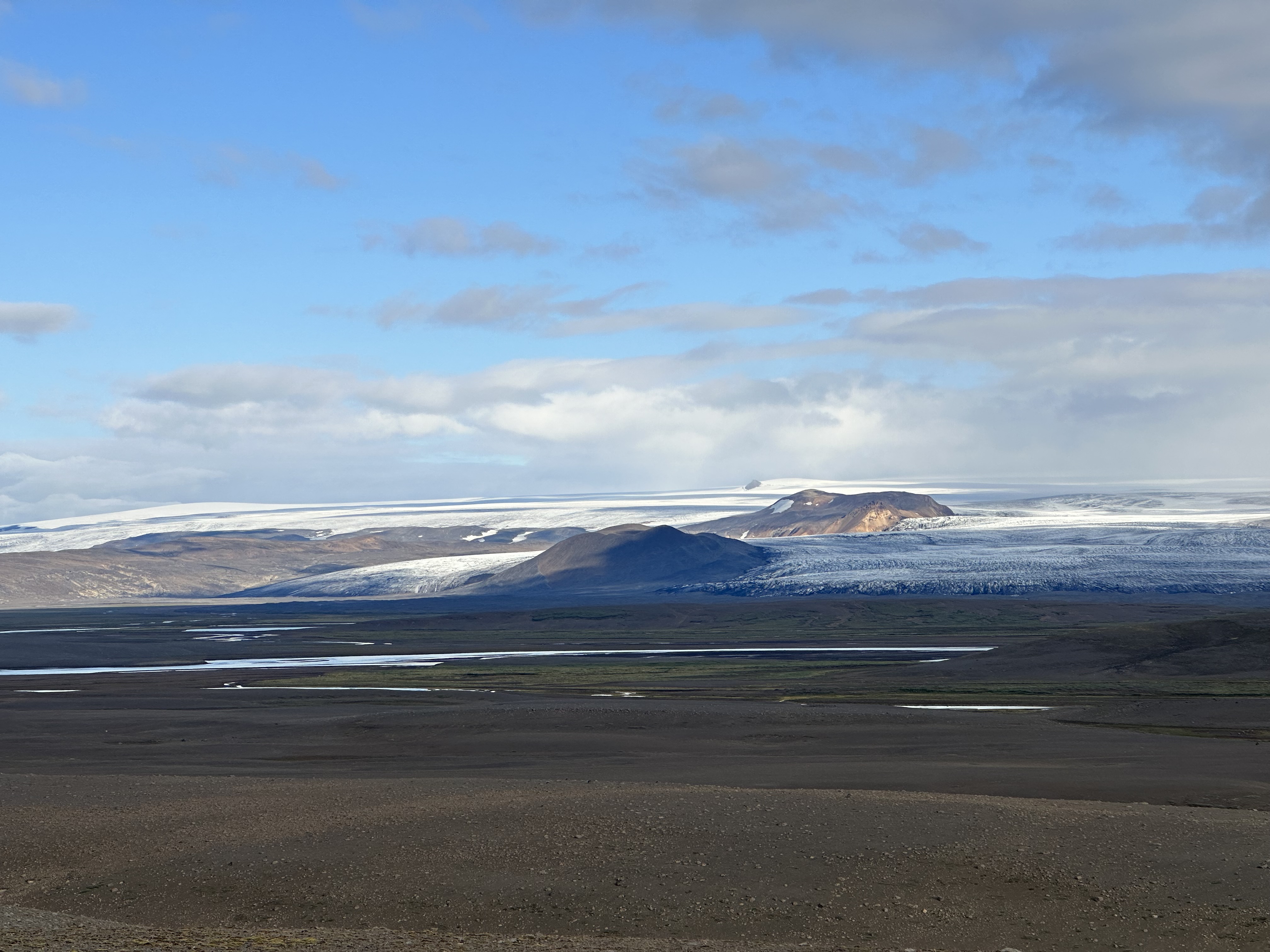 Soon, we had the sheer openness of space and the determination of getting this right. Music blasting, speed and efficiency at display. Gradually, the horizon started being subjected to various imposing manifestations of the glaciers. Hofsjökull to our right, and Vatnajökull to the left, were so awe-inspiring that they were worth all the effort to cross that enormous desert in between. We did spend some time taking photos and videos and enjoy the view.