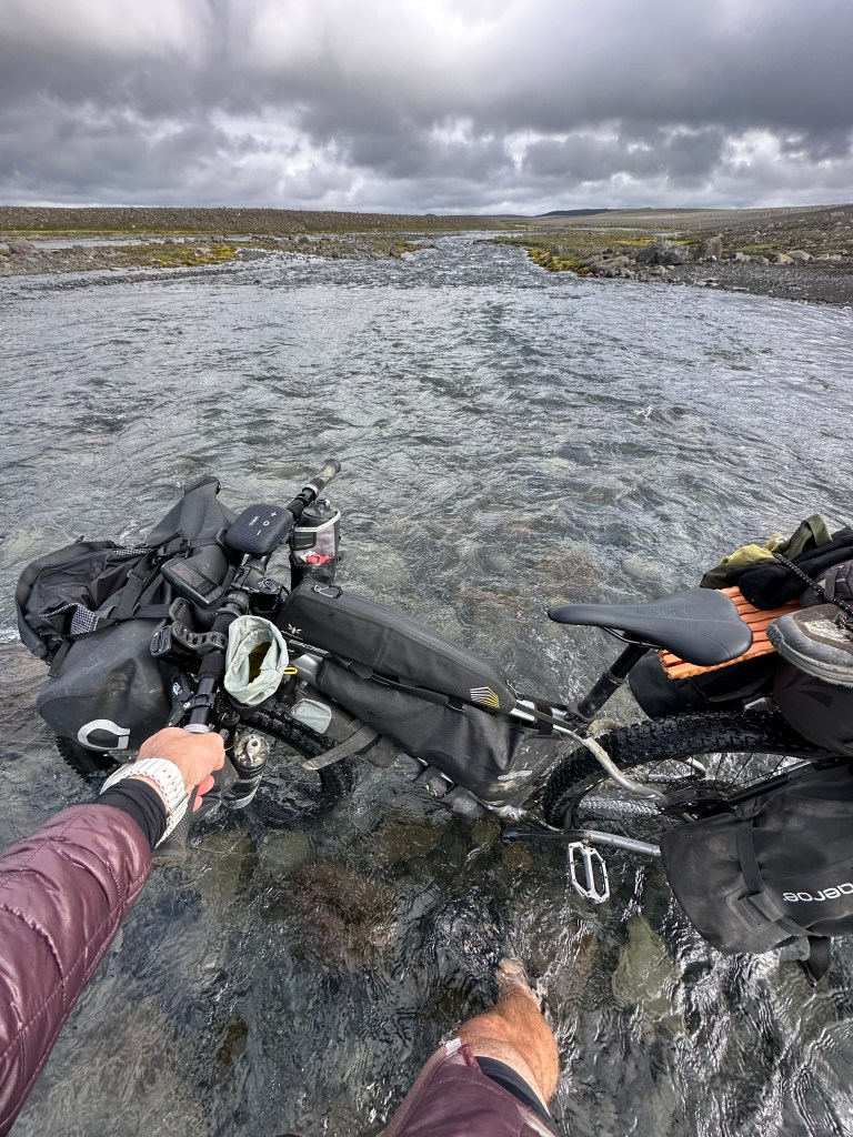 One tip we got from our research was to avoid going against the current (obvious, but not necessarily the shorter path across), and walk towards the other side along with the current, even if it meant you are walking diagonally. On one occasion, the current was strong enough that my bike ended up floating, being totally flat on the surface of the water that is. As I was barely holding on to it rather than carrying it, it was leading me fast along with the current, so there was no fucking point resisting. Those were the times that our initial nervous laughter had morphed into some rather inventive profanity-laden outburst pretty swiftly. I took it in turns with Josh, waiting for one of us to start crossing and get to the middle, shout out any impressions (“fucking freezing, run for your life!”, or more rationally…”errr,…mate, maybe try another way, cause I am drowning here”), before the other followed with any necessary adjustments to his path.