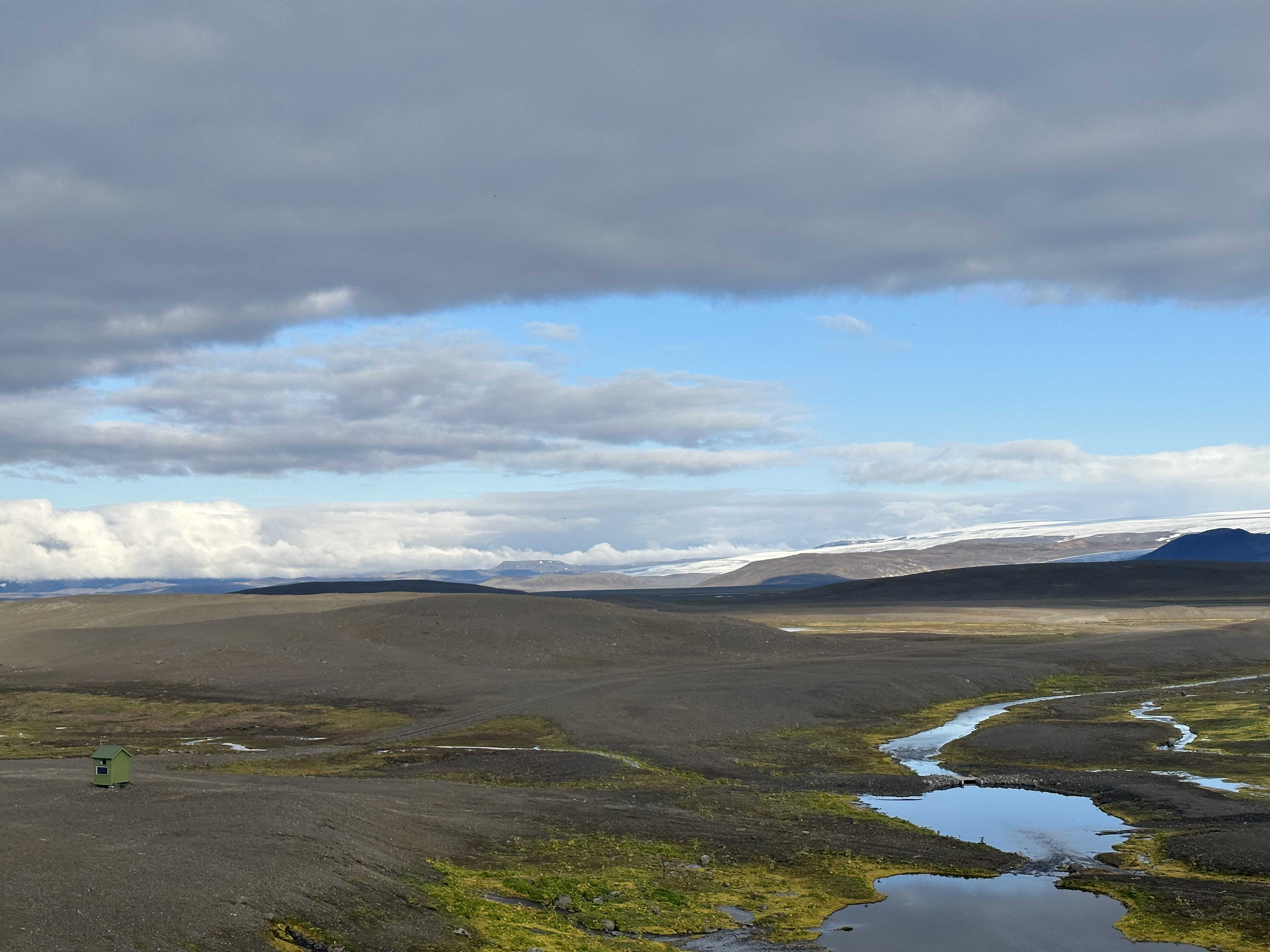 Needless to say, i was not exactly sitting on the medieval plank seat, but crouching, yet nonetheless, having done the deed and cleaned the aftermath and as i was marvelling the view, naturally I ended up standing. Urðarháls volcano was right at the back in the east, whilst behind the hut and out of view was Kistufell mountain and Vatnajökull glacier. So, there I was, half naked, towering on top of Olympus near the stratosphere, with the breeze refreshingly airing all my bits, hands on the waist, marveling that huge array of a panorama longer than expected, longer than needed even, all that emptiness, the barren valley, the hills at the back, the movement of clouds in that infinite sky….