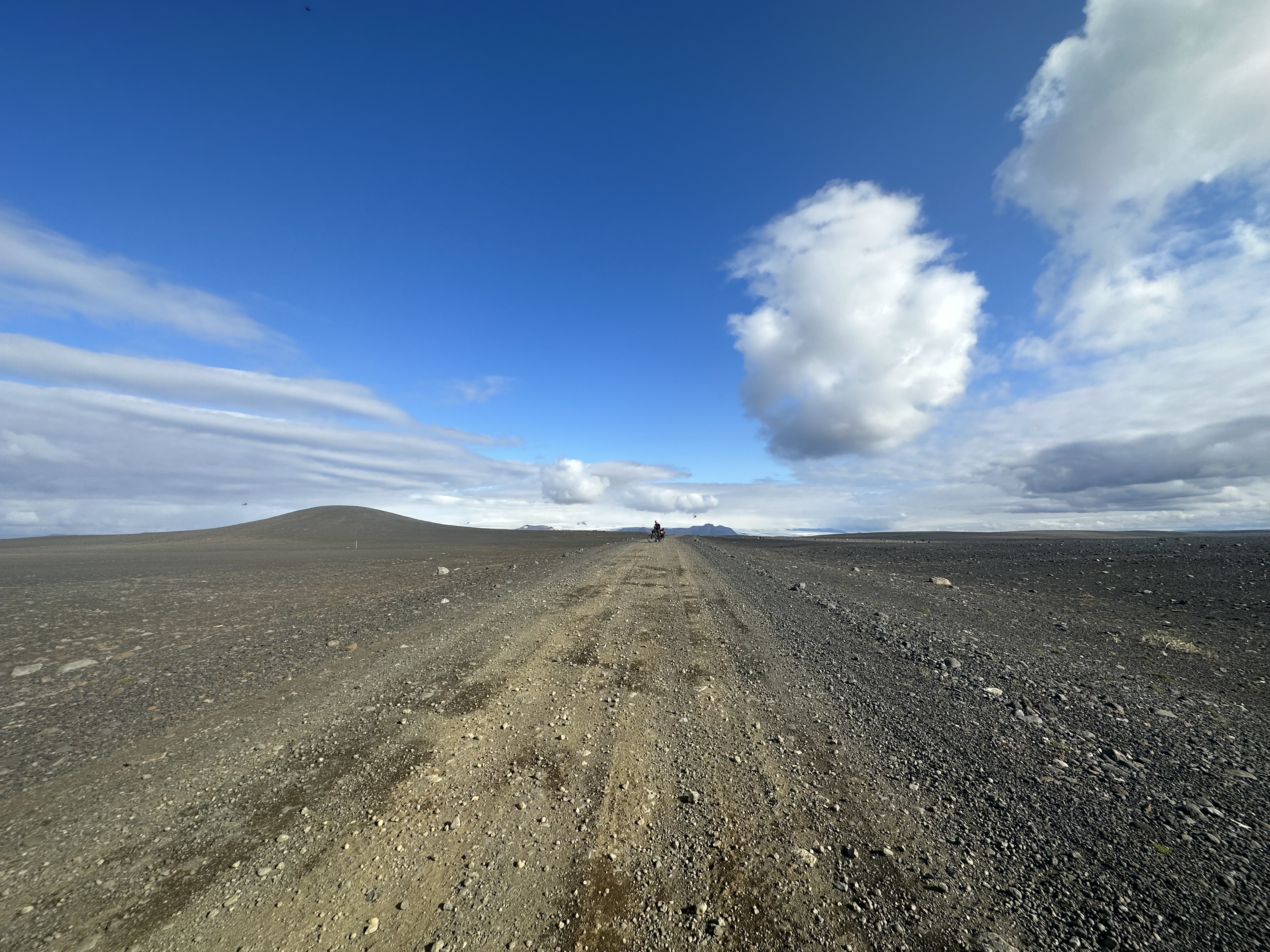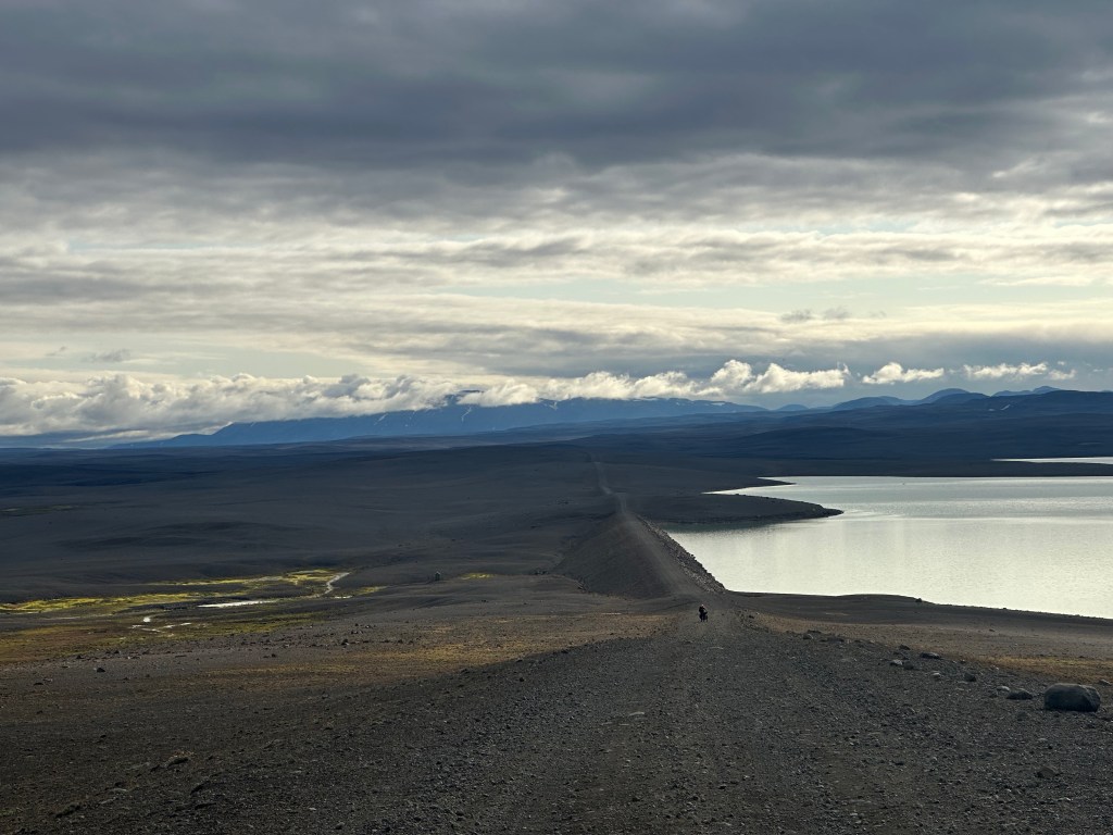 Just before Lake Kvislavatn at 565m elevation we left F26 and turned west, around the lake before we connected back with F26. That detour was down to the advice of the ranger who said that this would be “easier” way to get to our destination, as the alternative road was apparently much harder. With the glaciers’ view firmly behind us, our landscape also changed concerning what we had experienced before. There were endless straight roads; but also we didn’t have to cross rivers carrying our bikes, as there were bridges! After the detour, and with lake Kvislavtn to our left, all we had in front of us were direct lines, up and down the hills, and beautiful skies and clouds and blue waters and, and, and….oh, you can look at the photos, I suppose.